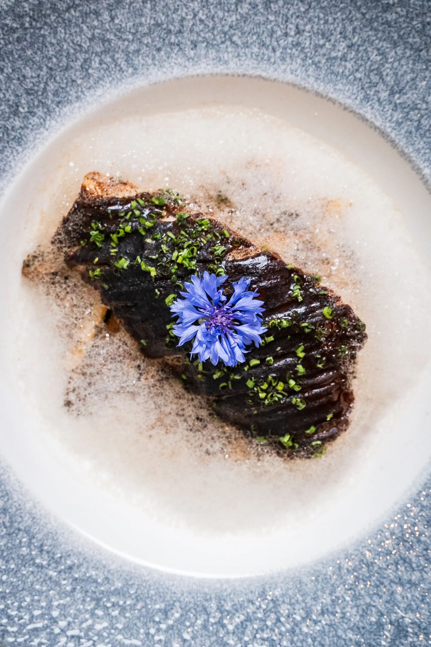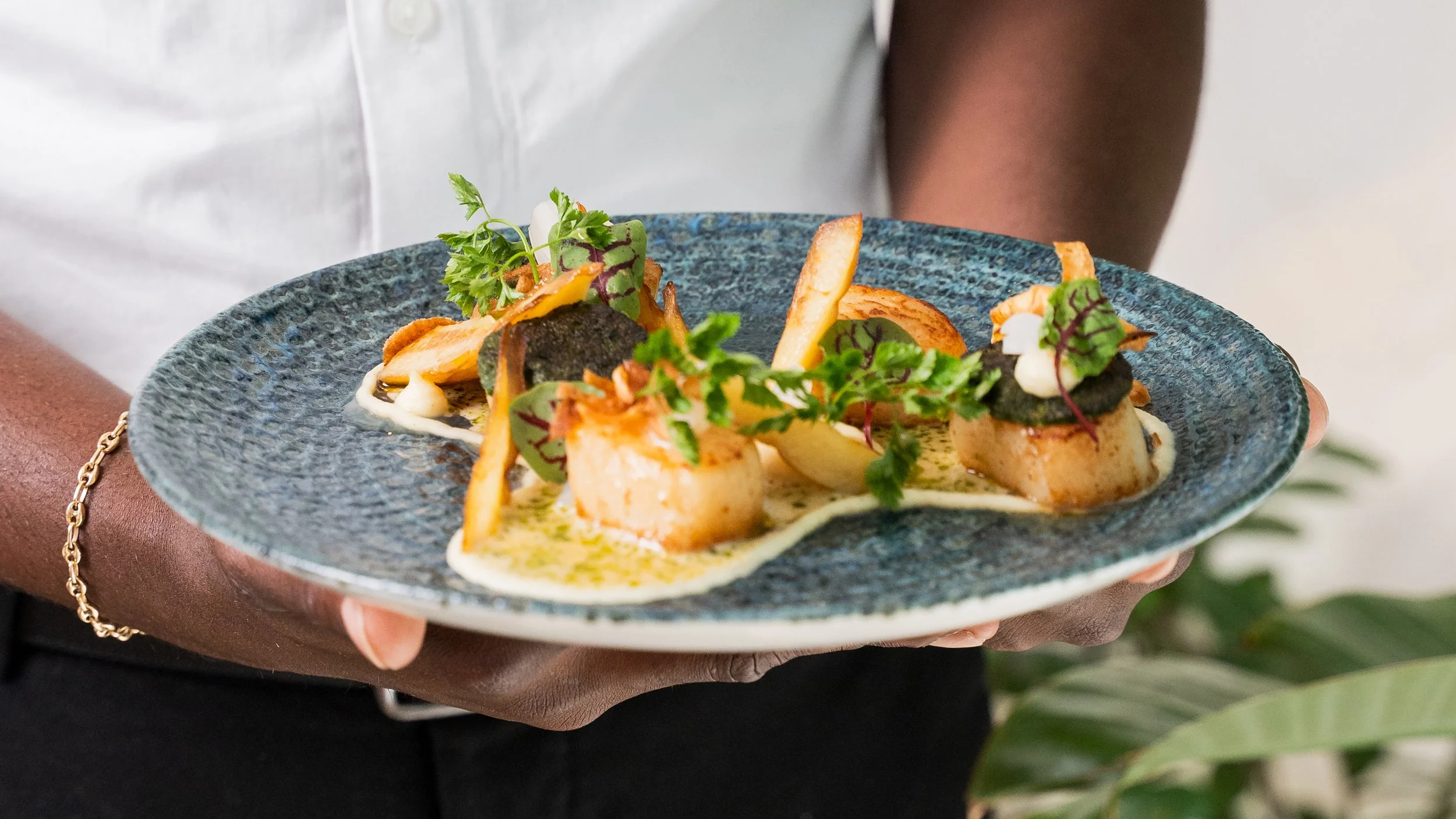 Bar rayé poêlé servi avec une purée de panais, des oignons perlés marinés, du panais sauté, des chips et une sauce au vin blanc