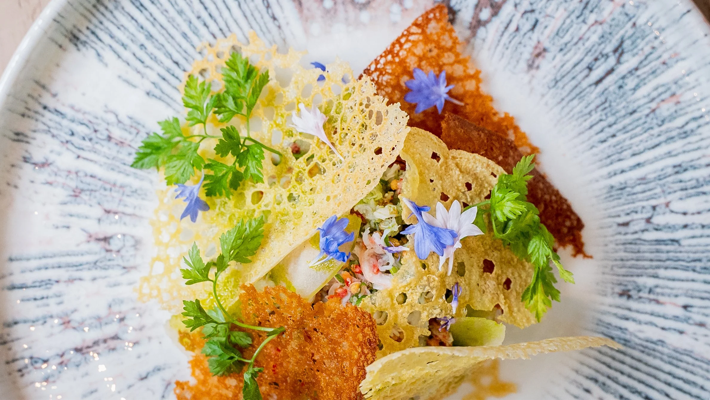 Crabe à carapace molle, concombre, masago, flocons de tempura, bonite